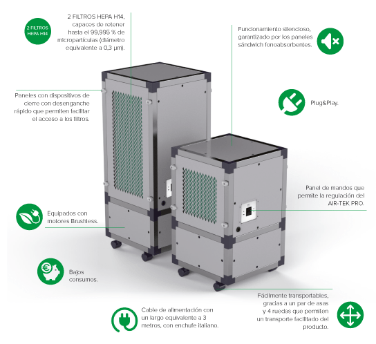 Los depuradores de aire Air-tek Pro 150 y 300 están diseñados para cubrir áreas de hasta 100m². Están compuestos por una serie de filtros, incluyendo un H14 HEPA, con capacidad de retener hasta el 99,995 % de micropartículas (diámetro equivalente a 0,3 µm).