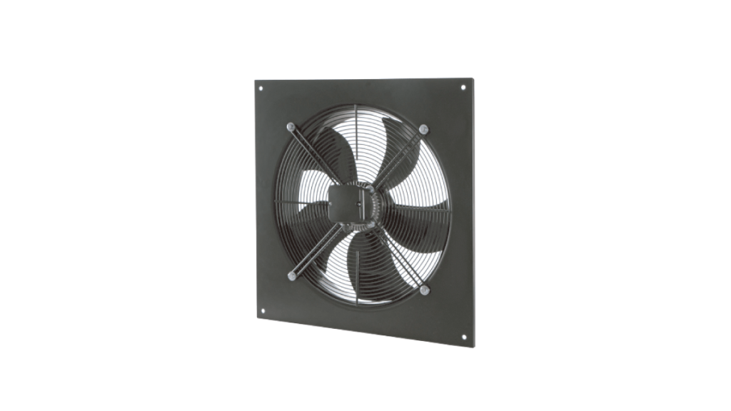 Ventiladores axiales industriales de pared,espesor reducido. Paneles en chapa de acero recubiertos con pintura en polvo de poliéster color negro, capaz de soportar las condiciones atmosféricas. Las bocas forman un cuerpo único con los paneles y están calibradas para optimizar el flujo de aire y facilitar la conexión con el ducto.